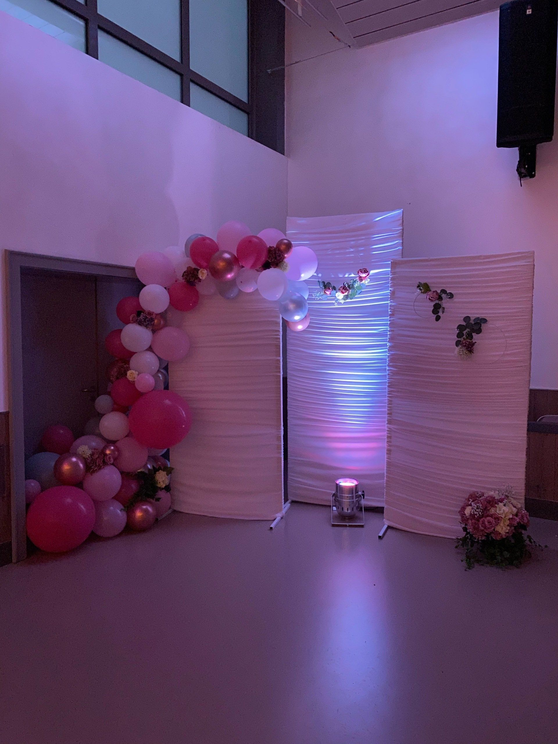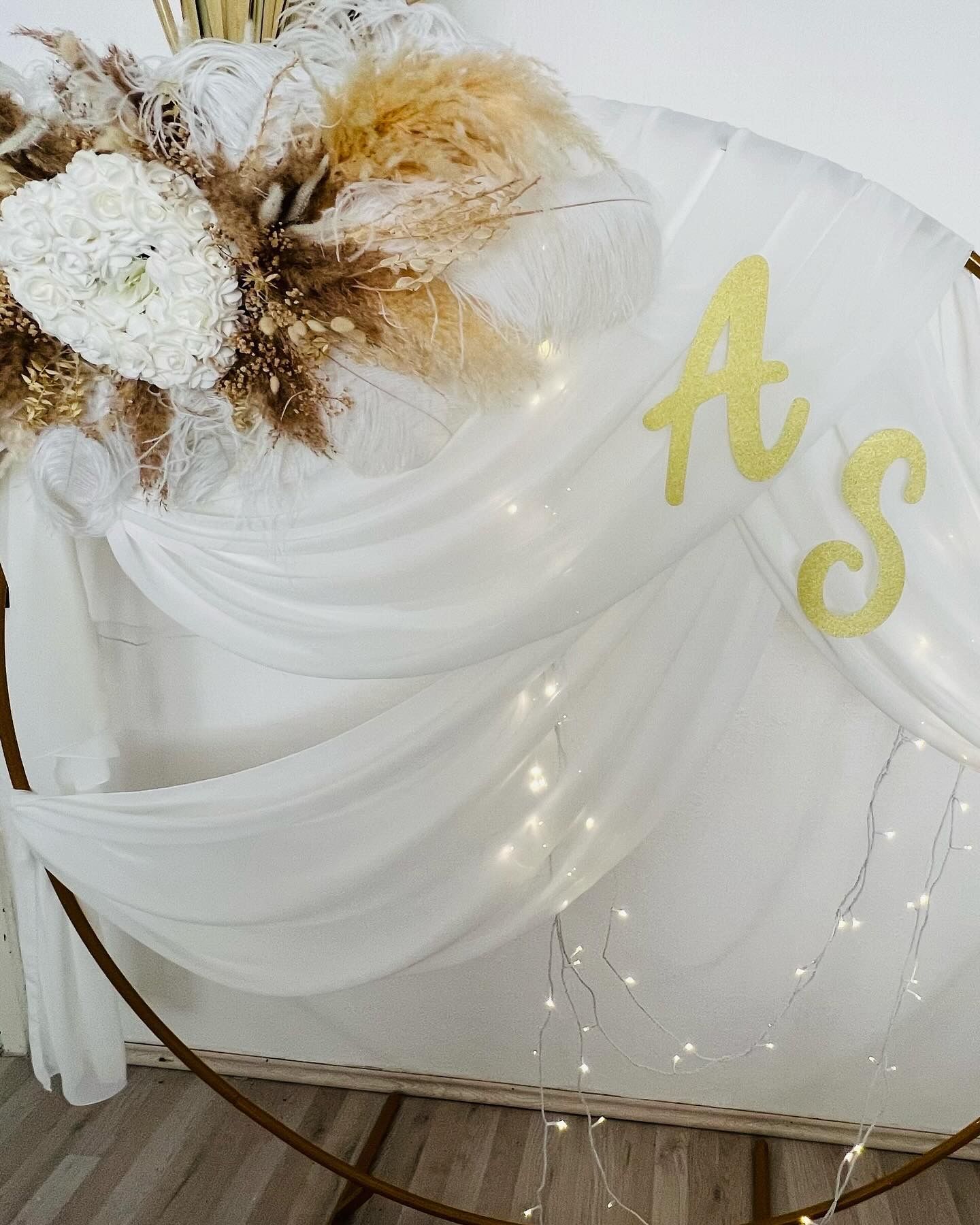 Fotohintegrund Traubogen mit Stoff & Eukalyptus Girlande dazu drei Pappsäulen