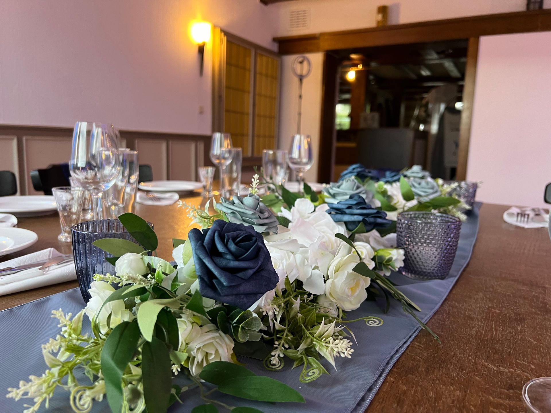 Tischdekoration mit blauen Wundlichtern und Gesteck